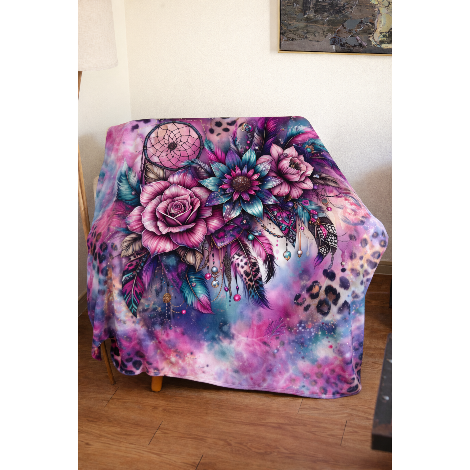 Designed with an intricate dream catcher, flowing feathers, and calming tones, this blanket brings a soft, boho-inspired feel to any space. It’s perfect for creating a cozy atmosphere while adding a touch of meaning and style to your home.